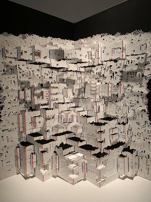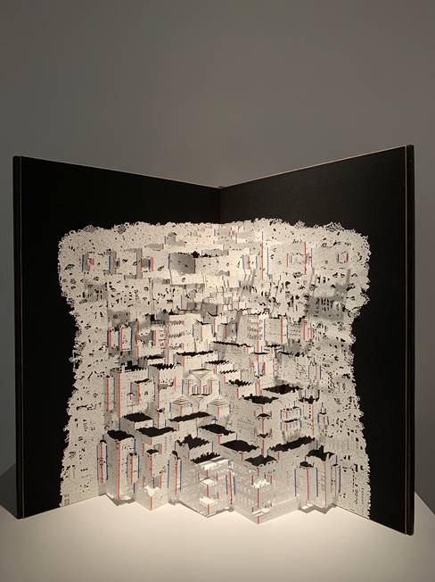 本次展览受邀艺术家包括蔡国强、邱志杰、陈琦、施慧等国内外知名艺术家,作为本次展览最年轻的受邀艺术家,唐征维老师的参展作品是他最新创作的系列作品《碳折叠 NO.3》和《子夜系列》。《碳折叠 NO.3》是碳折叠系列作品的第三件,主要通过纸艺术的形式阐述对西方碳金融背后的权力架构的思考,作品尝试将排放的主要基础——工业体组合成一个“排放帝国”,在手法上融合剪纸与立体折纸,最后形成书籍的样式,这个“排放帝国”在书的开合中形成存在与超越。《子夜系列》作品均是在特定的时间——子夜完成的构思,设计构思在意识显像的那一刻形成并被记录下来,然后通过剪纸的形式再创作出来。近年来,唐征维老师凭借独特的作品语言和深邃的思想深度在纸艺术领域崭露头角,多次参加国内重要展览,作品被中国美术公司、金杜艺术中心等机构收藏。
