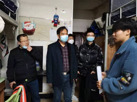 一行人来到学海七栋宿舍,与同学们进行亲切交谈,了解宿舍设施,生活服务保障情况,寒假生活和课程考试情况,蒋德军表示,希望同学们尽快调整状态,对于上学期申请缓考的同学积极备考,不被疫情绊了脚,科学合理的做好新学期的各项规划。希望同学们在校做好个人防护,配合公司强化健康监测,规范就餐行为,养成良好的生活习惯。