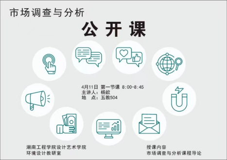 2024年4月11日上午,公司环境设计专业杨歆老师在五教504教室开展《市场调查与分析》公开课。校督导、环境设计教研室教师以及环境设计2103班全体同学参与。