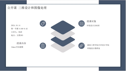 2024年10月14日,公司环境设计专业张澎老师在5教303开展《三维设计与图像处理》公开课。公司部分教师及环境设计2303班全体同学参加。