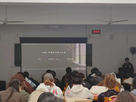 了解是成功的前提。柯禹详细介绍了学科竞赛的基本内涵和作用,让同学们对竞赛内容有了初步了解。他以环境设计专业竞赛作品为例,从背景分析、设计说明、设计灵感、元素提取和平面布置等方面进行了深入分析,向同学们讲述了竞赛作品的绘制方法。
