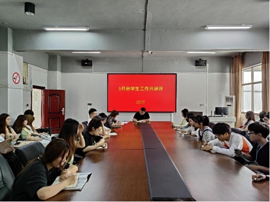 5月28日,五月份员工工作月讲评在五教二楼会议室召开。本次会议由公司党委副书记缪智文主持,学办全体辅导员及各班班长、团支书参加。