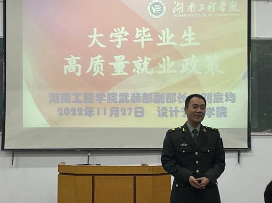 然后,校武装部副部长刘宸均提出“老员工如何高质量就业?”“老员工如何实现个人价值?”“我能给国家和社会做些什么?”三个问题引发同学们深入思考。随后,他为同学们列出了“参军入伍七笔账”。全方位、多角度向同学们详细介绍了入伍流程、优先优待、选用培养、应征条件、优惠政策等相关问题。