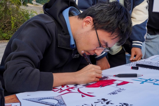 活动现场,学子们策划、起笔、勾线、填色,他们聚精会神地用笔触勾勒着轮廓线条。自动化2301班的谢同学在画鲁班锁,她说道:“我觉得鲁班锁的精巧和缜密,展现了执着专注、精益求精的工匠精神。”我院的员工集思广益,他们认为湖湘文化与湖湘传统技艺共同孕育的湖湘工匠精神有非常鲜明的特点,因此他们手拿画笔,专注地在画纸上挥毫泼墨,经过近3个小时的努力,“湘匠”二字跃然纸上,生动再现了当时匠人们专注于手工技艺的场景。还有同学在卷中写字,挥毫写下了“工匠精神”四个大字。活动现场还展览了员工已有的工匠作品,吸引了很多人的驻足。现场还邀请观看的同学一起参与,共绘画卷,一个个灵动的图案在画卷上涌现,一幅幅精彩的作品呈现在画卷上。